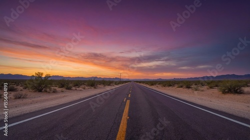 Naklejka premium Vast Desert Highway Stretches Into the Horizon Under a Colorful Twilight Sky...