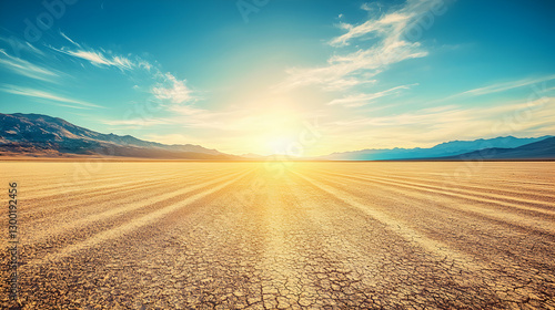© Mu, Fototapeta premium Vast Desert Landscape at Sunset with Golden Sand and Blue Sky