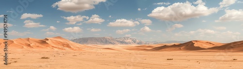 Naklejka premium Vast desert landscape featuring golden sand dunes under a bright blue sky with fluffy clouds, perfect for travel and nature themes.