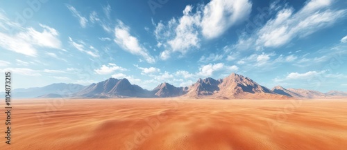© Fatwaram, Naklejka premium Vast desert landscape under a bright blue sky with distant mountains.