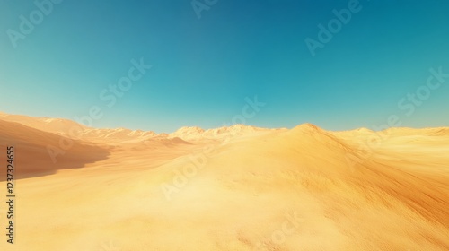 Naklejka premium Vast desert landscape under a clear blue sky with rolling sand dunes and...