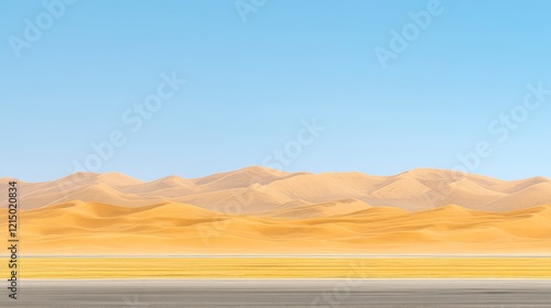 Fototapeta premium Vast Desert Landscape with Golden Sand Dunes and Distant Mountains Under a Clear Blue Sky