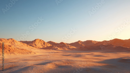 © Keopaserth, Fototapeta premium vast desert landscape with rolling sand dunes and mountains under clear blue sky, evoking sense of tranquility and isolation