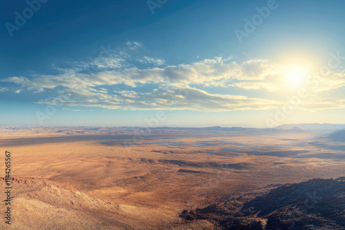 Naklejka premium Vast desert landscape with solar panels under a bright sun and scattered clouds.