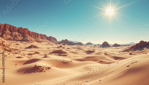 Naklejka premium Vast desert landscape with sunburst above sand dunes and rocky cliffs on a clear day