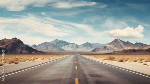 Naklejka premium Vast Desert Road with Majestic Mountain Backdrop Under Cloudy Sky