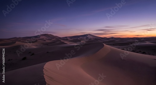 Fototapeta premium Vast desert sand dunes under a dramatic twilight sky with a gradient of purple to orange