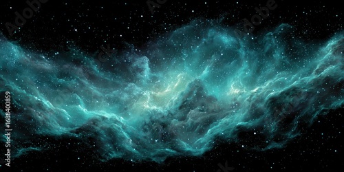 © adi, Fototapeta premium Vast expanse of a swirling turquoise nebula, scattered with distant stars