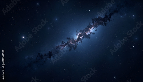 © Muk, Fototapeta premium Vast expanse of deep blue and black space reveals a glowing galaxy cluster with stars.