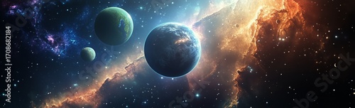 Obraz premium Vast Expanse of Space Reveals Colorful Planets and Swirling Galaxy at the...