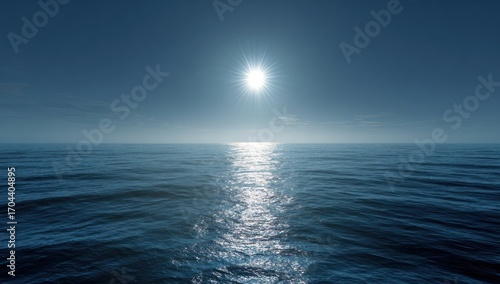 © Abi, Obraz premium Vast expanse of tranquil ocean surface, illuminated by a bright sun, reflecting serene calmness.
