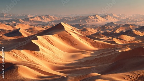 © Awut, Naklejka premium Vast Expansive Desert Landscape with Golden Sand Dunes and Mountainous Background under Clear Sky Du Sunset or Sunrise
