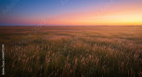 © Quiet, Fototapeta premium Vast Field of Tall Grass Bathed in the Golden Light of a Setting Sun