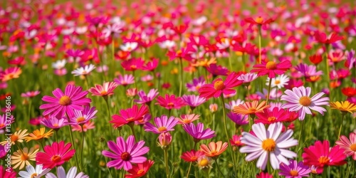 Naklejka premium Vast field of vibrant cosmos flowers swaying gently in the breeze, purple, white