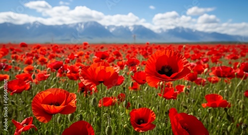 Fototapeta premium Vast Field of Vibrant Red Poppies Blooming Under a Beautiful Blue Sky with Snow-Capped Mountains in the Distance