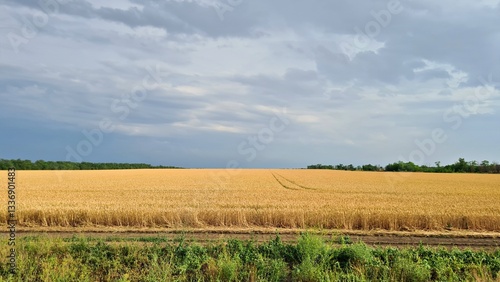 Fototapeta premium Vast fields with ripened wheat against the backdrop of a gloomy cloudy autumn sky