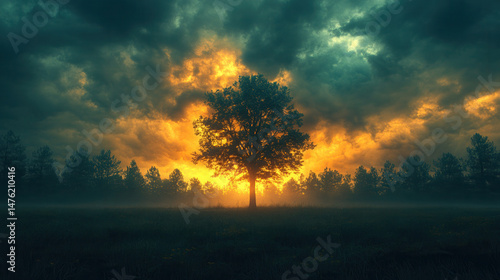 © BANDERSOUL, Naklejka premium vast forest with tall tree under dramatic sky