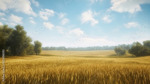 © CLOVER BACKGROUND, Fototapeta premium Vast Golden Wheat Fields Under Bright Sunlight in Clear Sky