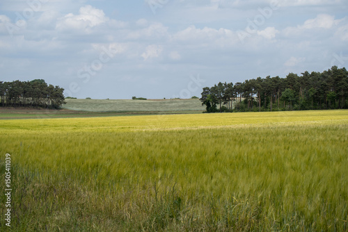 © Jannik, Fototapeta premium vast Grain Field Under Blue Sky with Distant Forest Line
