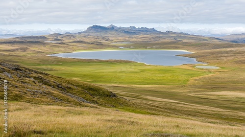 © Adobe, Fototapeta premium Vast Grassland Landscape with Serene Lake and Distant Hills Under Cloudy Sky