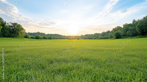 Fototapeta premium Vast grassy field at sunset, lush green expanse under a vibrant sky