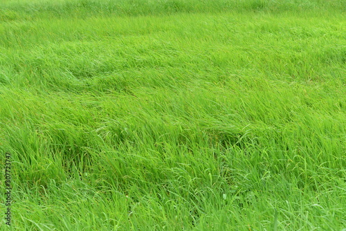 © tharathip, Obraz premium Vast green field at gorgeous sunset, a colorful panoramic landscape