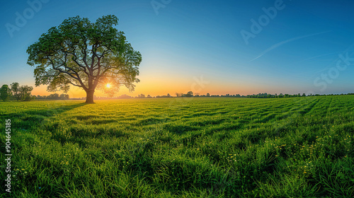 © LOPH Studio, Obraz premium Vast green field at sunrise with clear sky and horizon.