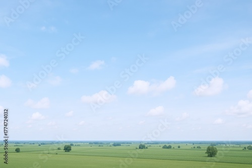 Obraz premium Vast Green Field Under a Blue Sky with Scattered Clouds, Serene Rural Landscape