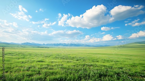 © MD, Fototapeta premium Vast green field under a bright blue sky with fluffy clouds.