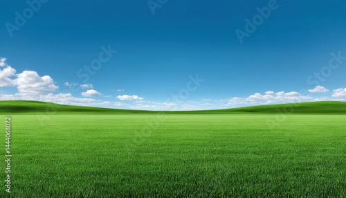 © Dounonji, Fototapeta premium Vast green field under a clear blue sky.
