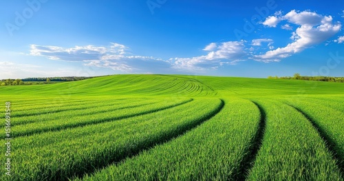 © fanjianhua, Naklejka premium Vast Green Field Under a Clear Sky