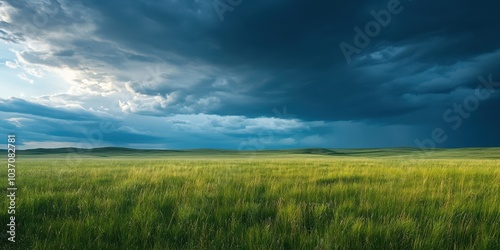 Obraz premium Vast green field under a dramatic stormy sky, nature's beauty captured...