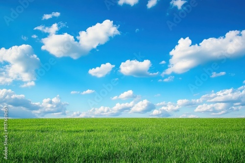 Fototapeta premium Vast green field under bright blue sky with fluffy white clouds during...