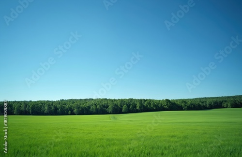 Fototapeta premium Vast green field under clear blue sky bordering a dense forest line. A subtle...