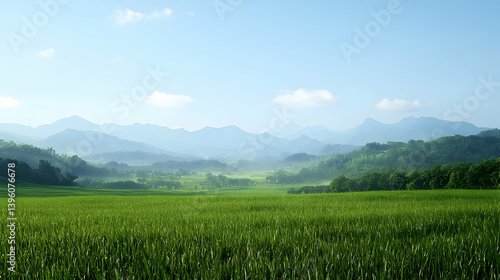 © artzone, Fototapeta premium Vast Green Field With Distant Mountains Under Clear Sky