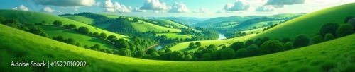 © Birdkab, Fototapeta premium Vast green fields, scattered forests, winding rivers , river, peaceful, meadow