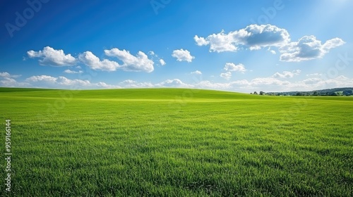 Fototapeta premium Vast green fields under a clear blue sky with soft white clouds, capturing a...