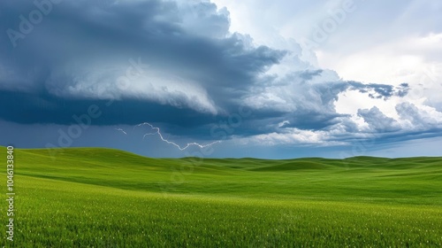 © Jiraporn, Obraz premium Vast green fields under a dramatic sky with dark clouds and contrasting light.