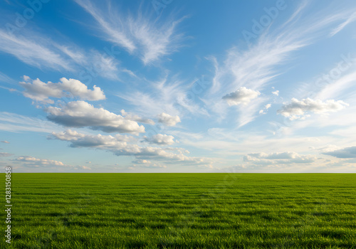 Fototapeta premium Vast Green Grass Field Under a Clear Blue Sky with Clouds and Sunlight