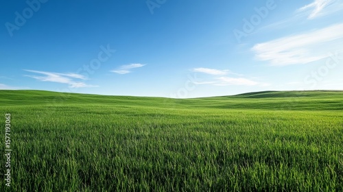 © aulaiphon, Fototapeta premium vast green grassland beneath a bright blue sky, peaceful view