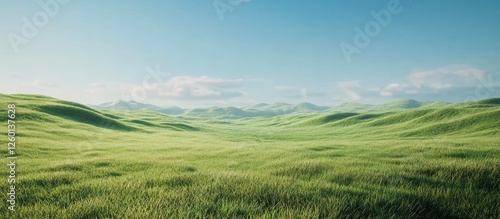 Fototapeta premium Vast green grassland under a clear blue sky with soft clouds scattered across...