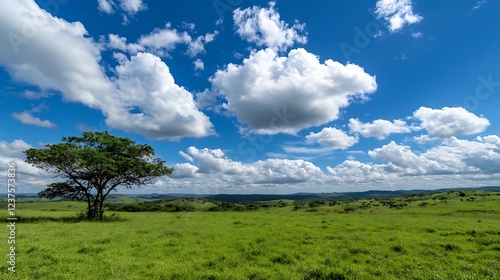 © Generative AI, Obraz premium Vast Green Landscape Under Scenic Sky With Solitary Tree and White Clouds : Generative AI