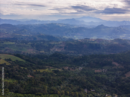 Fototapeta premium Vast green landscape with mountains in distance during early morning light