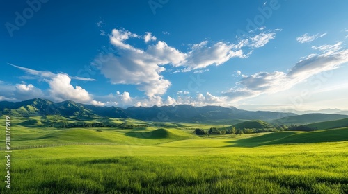 © Ndoomyim, Fototapeta premium Vast green landscape with mountains under blue sky