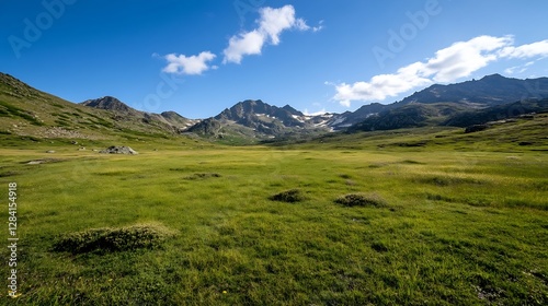 Fototapeta premium Vast green meadow surrounded by majestic mountains under a bright blue sky...