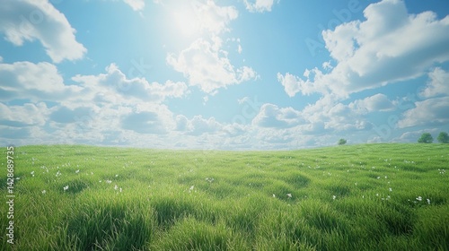 © Letitia, Obraz premium Vast green meadow under a bright blue sky with fluffy white clouds on a sunny day.
