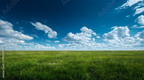 © Jojo*, Fototapeta premium Vast Green Meadow Under a Dramatic Blue Sky with Fluffy White Clouds.