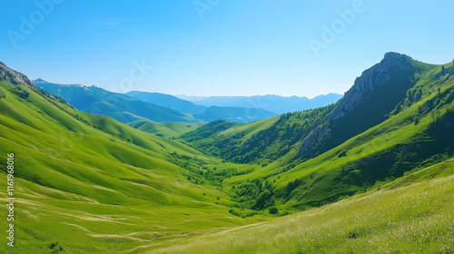 © LunaStar, Fototapeta premium Vast green valley under clear blue sky, natural beauty