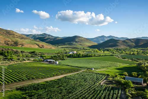 Naklejka premium Vast green vineyards stretch across the landscape, framed by majestic hills and a clear sky