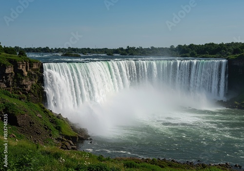 © Hiran, Fototapeta premium Vast horseshoe-shaped cascade, massive volume of water plunging into the basin below, creating a misty cloud and powerful roar ,cascade ,majestic ,vast